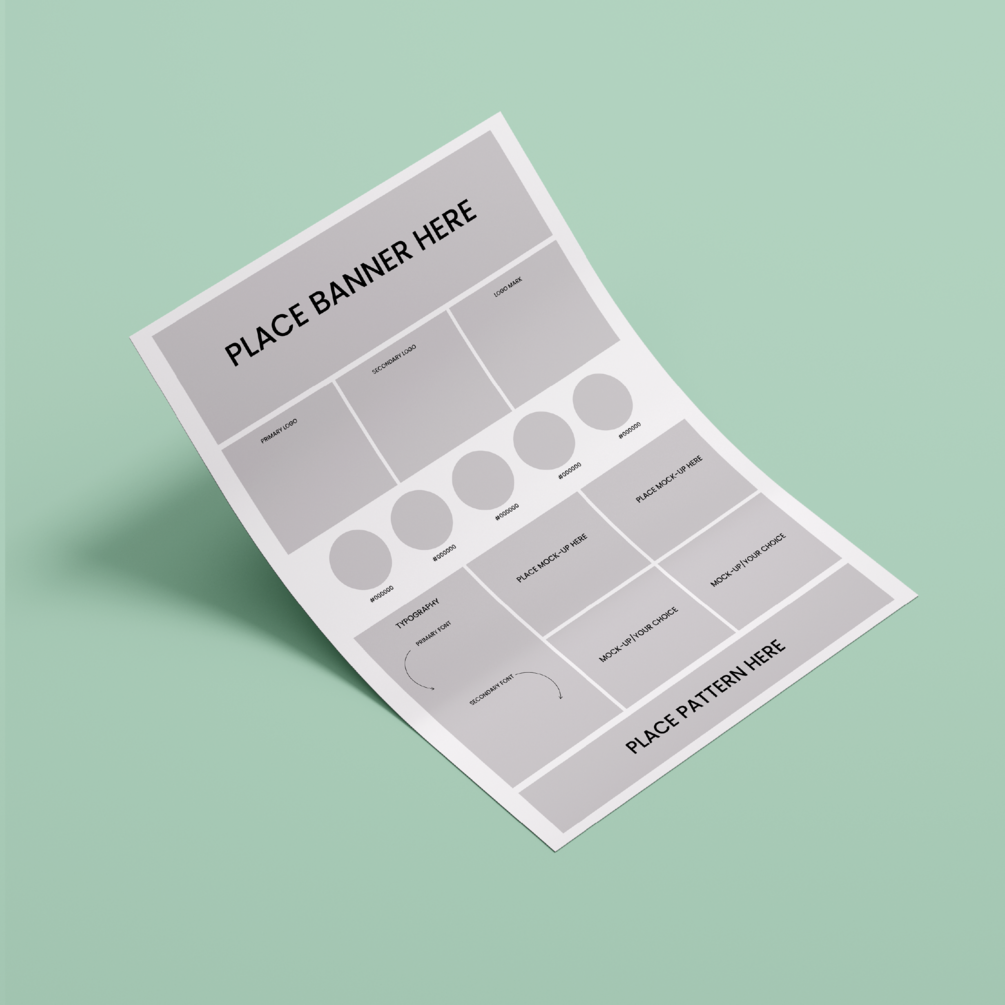 - Sections Include Banner, Logo variations, Colour Palette, Typography, 4 mock-ups (2 of your choice), and patterns.